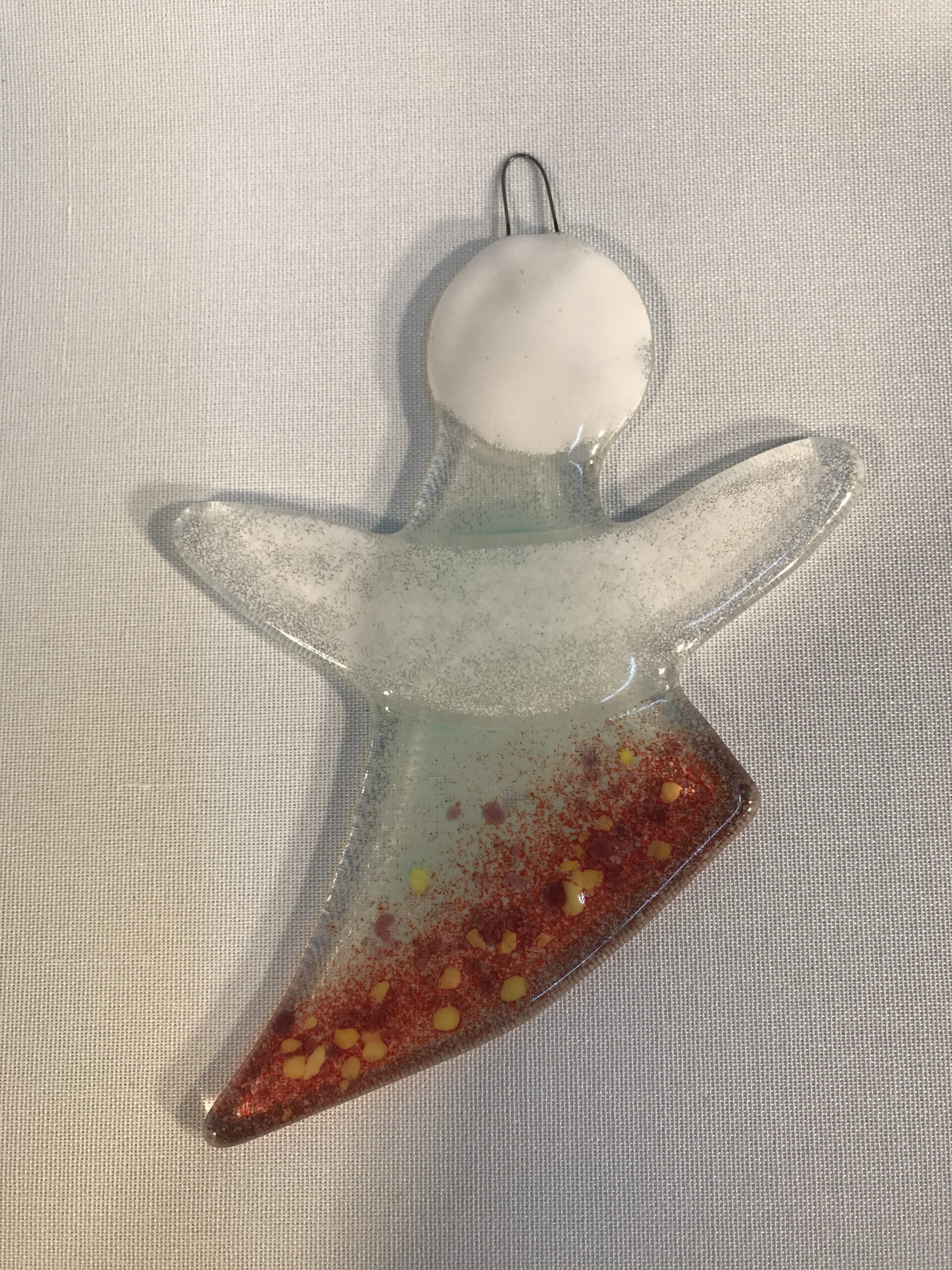 Die Engel werden aus Glas hergestellt und im Fusingofen verschmolzen. Am Kopf haben sie einen praktischen Drahtbügel um sie aufzuhängen.