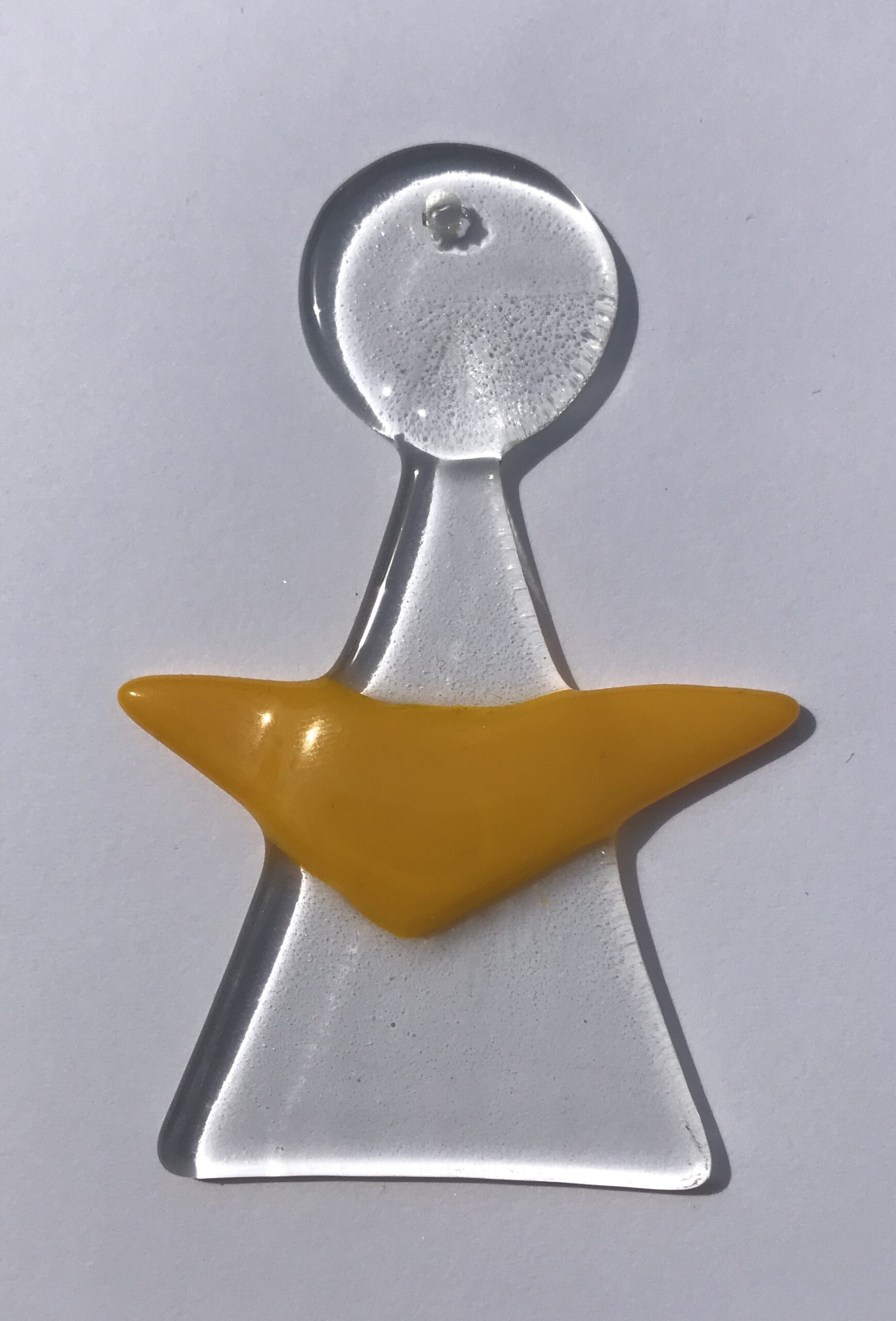 Die Engel werden aus Glas hergestellt und im Fusingofen verschmolzen. Alle Engel haben ein Loch um sie aufzuhängen.