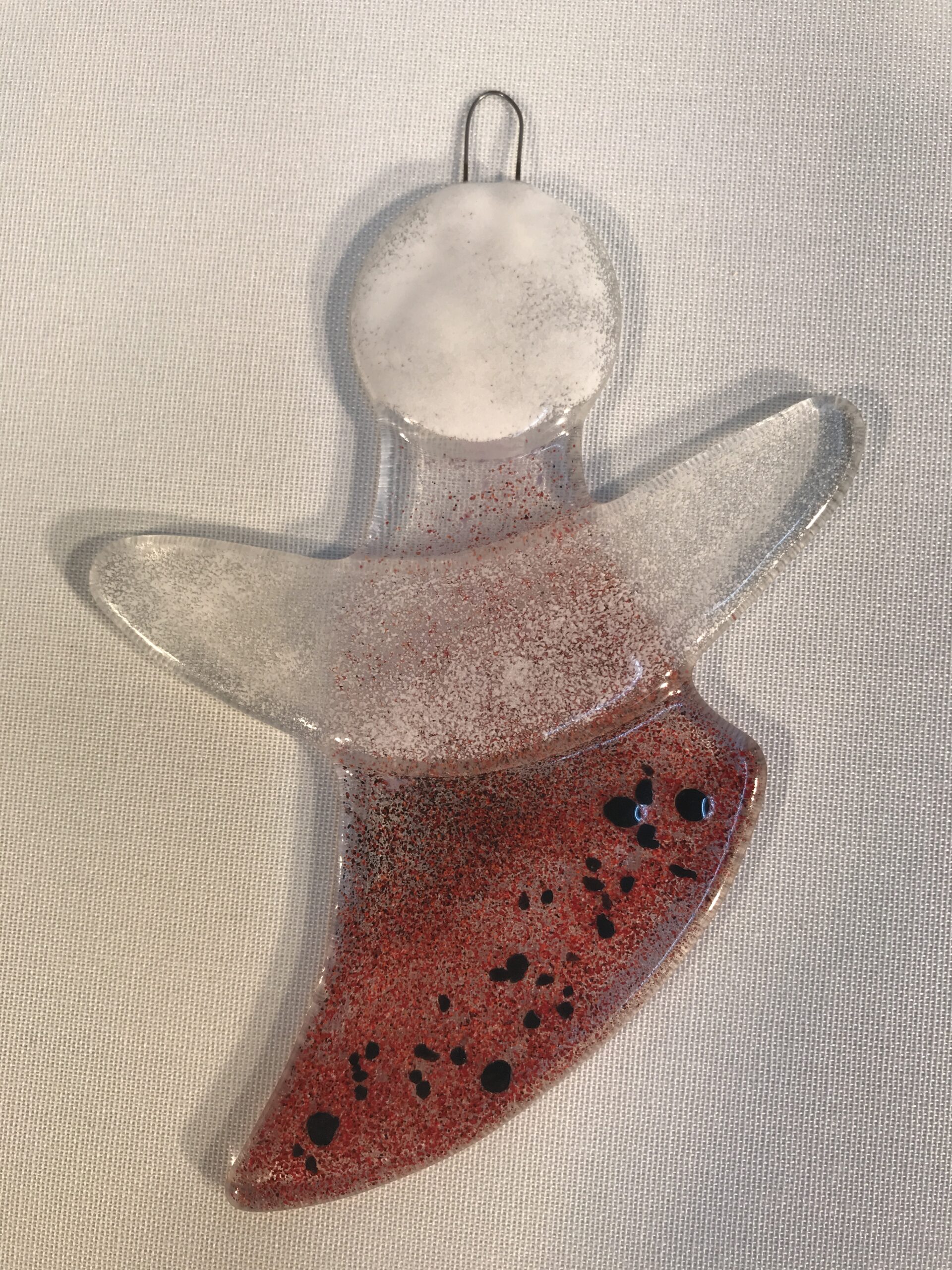Die Engel werden aus Glas hergestellt und im Fusingofen verschmolzen. Am Kopf haben sie einen praktischen Drahtbügel um sie aufzuhängen.